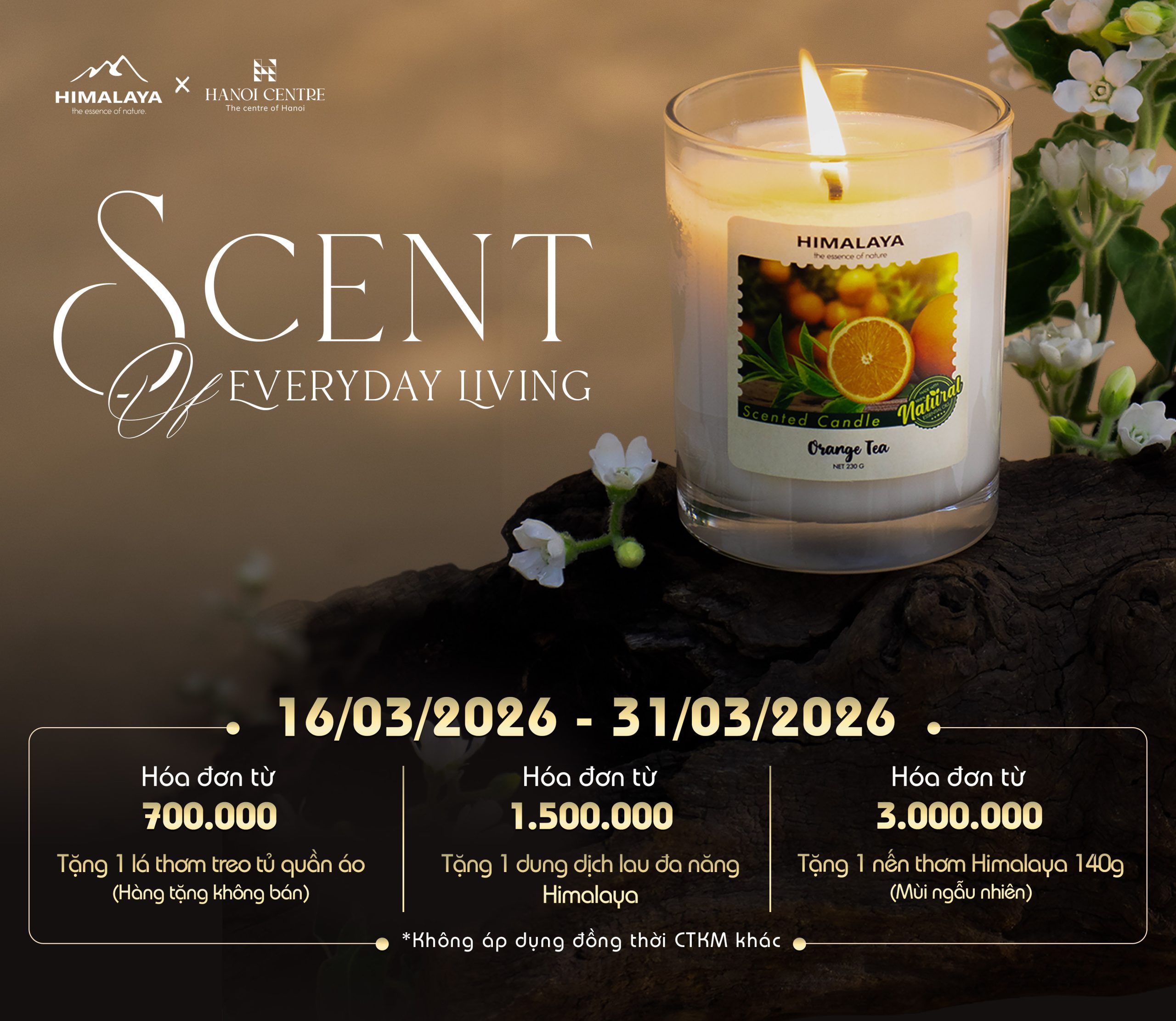 Khám phá chương trình khuyến mãi "Scent of Everyday Living" tại cửa hàng Himalaya từ ngày 16/03/2026 - 31/03/2026. Nhận ngay quà tặng Lá treo thơm, Chai lau đa năng và Nến thơm HImalaya 140g cho mỗi hóa đơn để vỗ về không gian sống thêm phần thư thái, trọn vẹn.