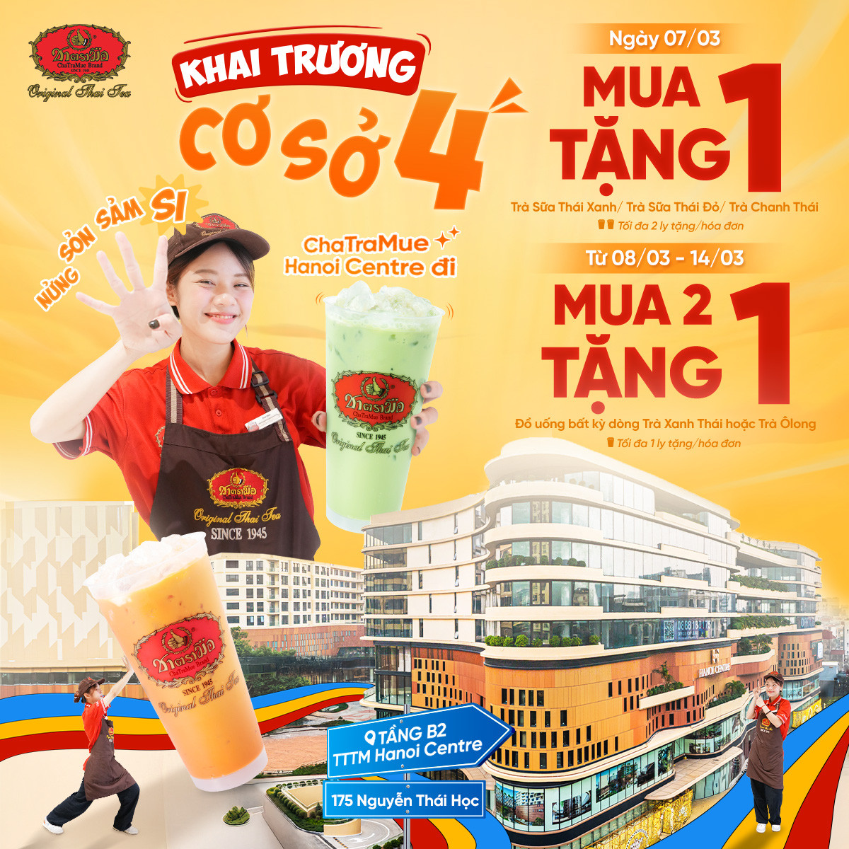 Hãy ghé thăm ChaTraMue Hanoi Centre từ ngày 7/3 để cùng bạn bè và người thân thưởng thức đại tiệc trà Thái hấp dẫn và không bỏ lỡ những ưu đãi khai trương đặc biệt chỉ có trong thời gian giới hạn tại cơ sở mới của ChaTraMue. Sự kiện hứa hẹn mang lại không khí sôi động và trở thành điểm dừng chân quen thuộc của cộng đồng yêu trà sữa tại khu vực trung tâm thành.